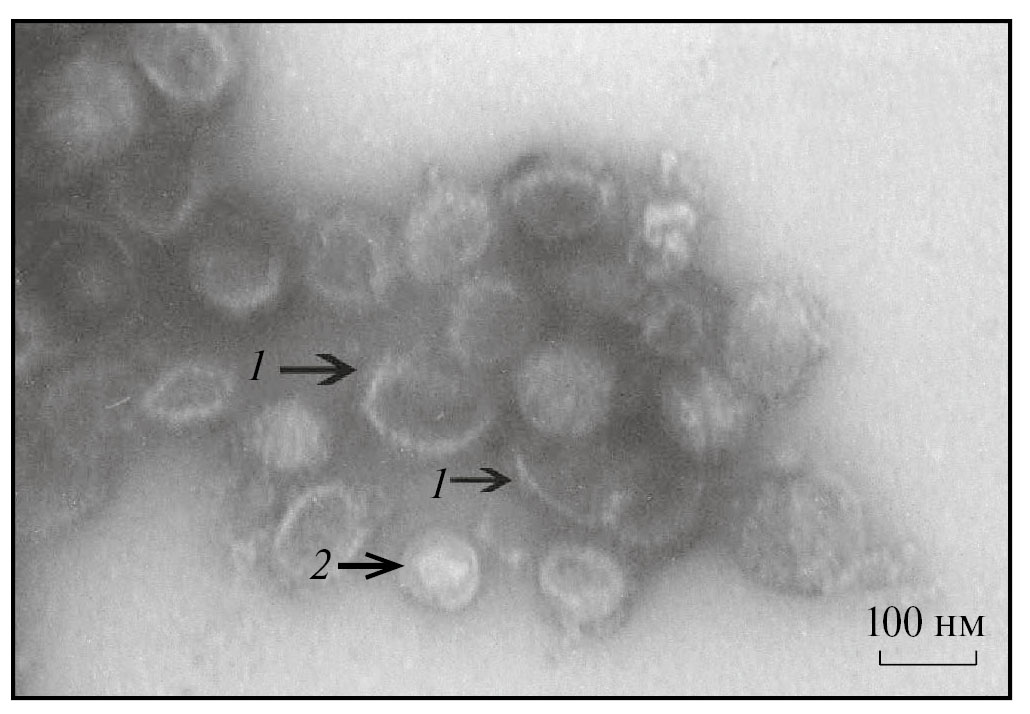 Рис. 1. Визуализация суспензии вируса гриппа А/California/07/09, инкубированной в течение 1 ч в водном растворе H5PMo10V2O40 (100 мкМ): 1 — пустые вирусные оболочки, 2 — интактные ВЧ.