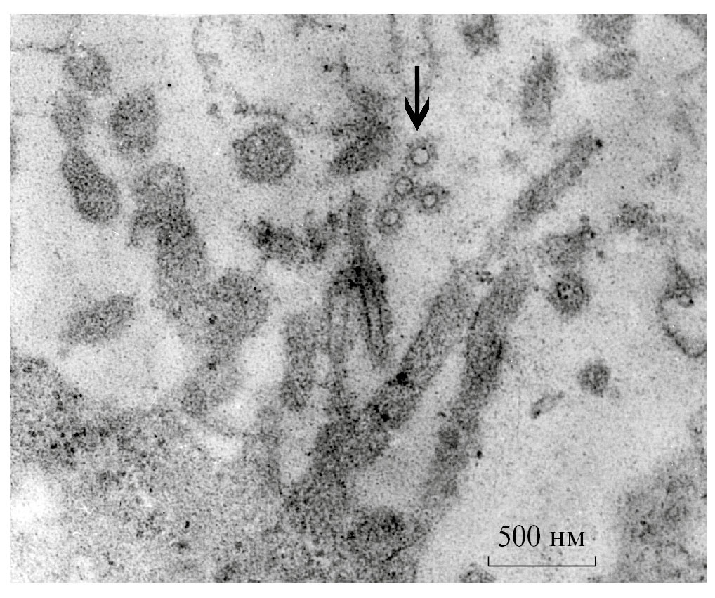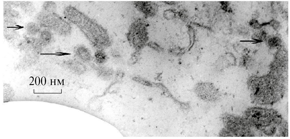 Рис. 4. Срез ворсинок на поверхности клетки МДСК после воздействия водного раствора Na5PMo10V2O40 (20 мкМ). Стрелкой отмечены дефектные частицы вируса гриппа A/California/07/09 с частично разрушенными и/или деформированными оболочками.