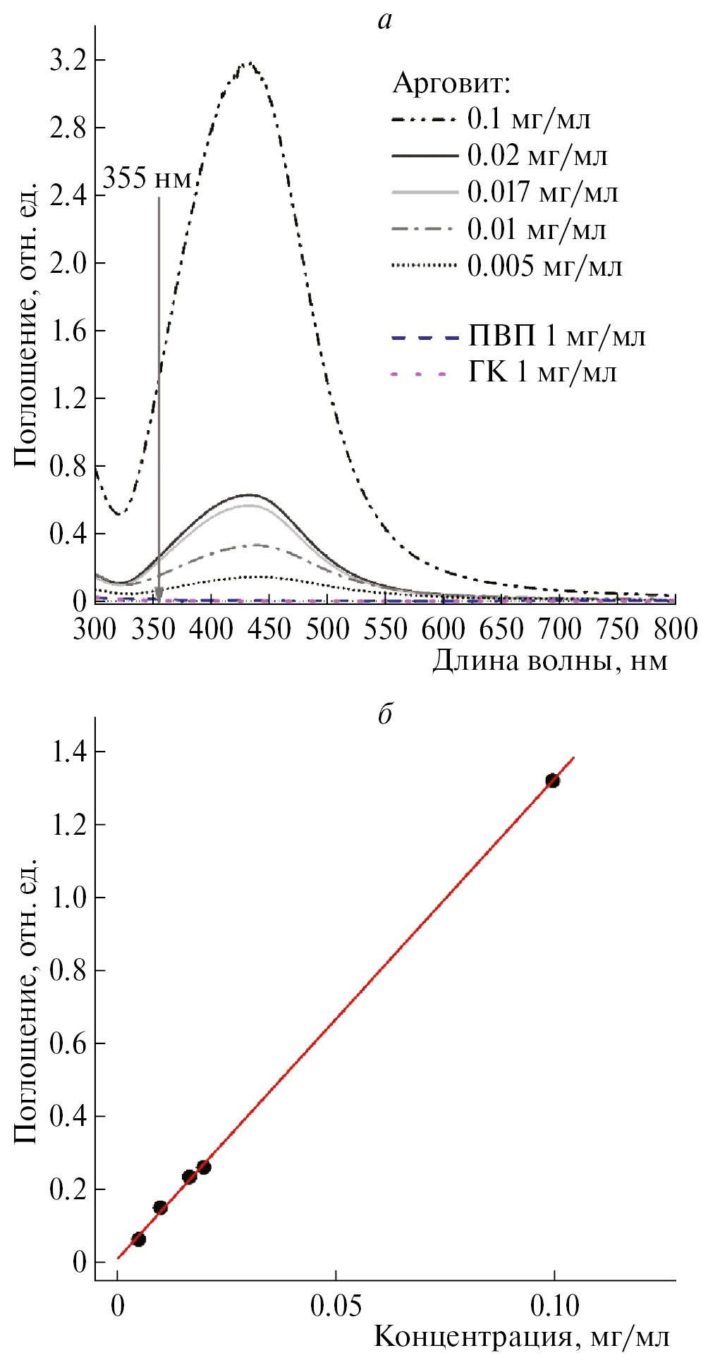 Рис. 2. а — Спектры поглощения чистого ПВП, чистого ГК и суспензии препарата “Арговит” при разных концентрациях наночастиц серебра; б — зависимость поглощения суспензии препарата “Арговит” на длине волны 355 нм от концентрации наночастиц серебра.