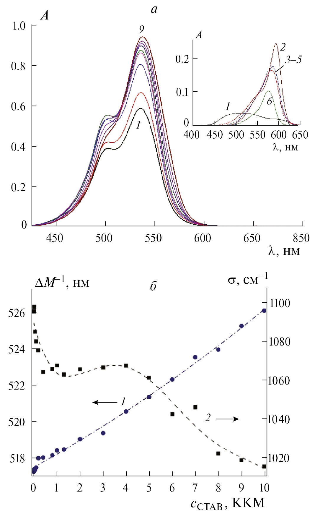 Рис. 3. а – Спектры поглощения красителя Cyan 2 (cCyan 2 = 1 ‧ 10–5 моль ‧л–1) при различных концентрациях CTAB: cCTAB = 0 (кривая 1), 0.10 ККМ (2), 0.20 ККМ (3), 1.01 ККМ (4), 2.01 ККМ (5), 4.0 ККМ (6), 6.0 ККМ (7), 8.01 ККМ (8) и 10.0 ККМ (9) в буферном растворе HEPES; на врезке – спектры поглощения Т-307 (cТ-307 ~ 1.5 ‧ 10–6 моль ‧ л–1) в отсутствие ПАВ (кривая 1), в присутствии ≥ 20 ККМ CTAB (2), Triton Х-100 (3), Brij 35 (4), Tween-20 (5) и SDS (6); б – зависимости ÄМ–1 (1) и óabs, полученные из спектров поглощения Cyan 2, от концентрации CTAB; в – спектры флуоресценции (1, 3, 5) и возбуждения флуоресценции (2, 4, 6) Cyan 2 при ≥ 20 ККМ CTAB (1, λex = 520 нм; 2, λreg = 600 нм) и Т-307 при ≥20 ККМ CTAB (3, λex = 550 нм; 4, λreg = 630 нм) и при ≥20 ККМ SDS (5, λex = 550 нм; 6, λreg = 620 нм). На врезке – зависимость интенсивности флуоресценции красителя Т-307 (cT-307 ~ 1.5 ‧ 10–6 моль ‧ л–1) от концентрации SDS ((2.2÷20) ККМ; λex = 550 нм, λreg = 596 нм).