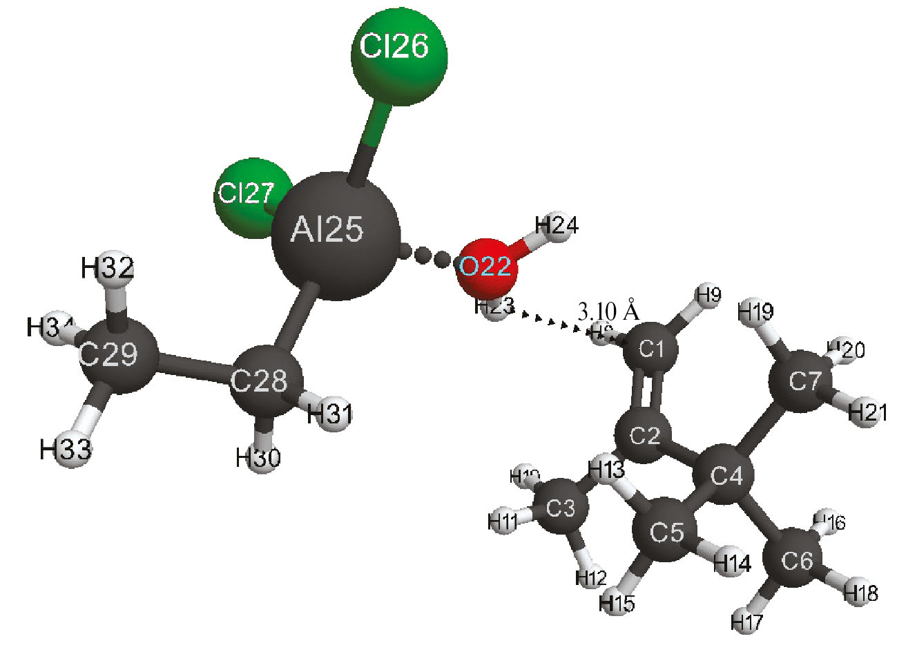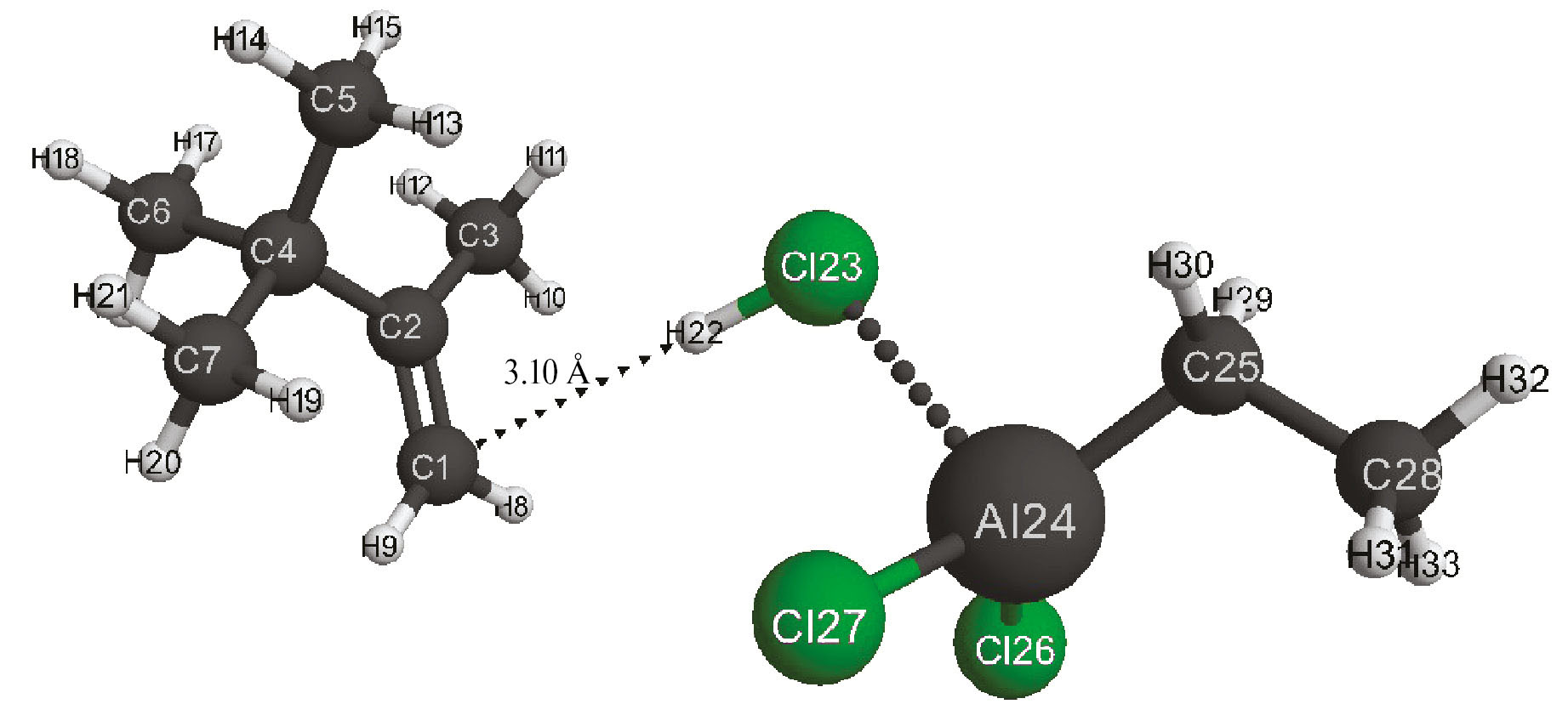 Рис. 7. Структура исходной модели комплексного катализатора AlCl2C2H5–соляная кислота (Cα) с 2,3,3-триметилбутеном-1.