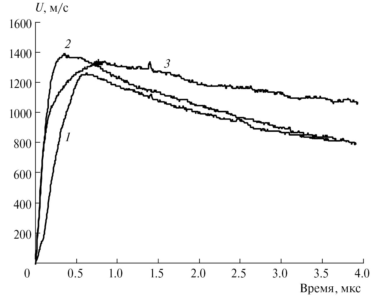 Большое количество алюминия в исследуемых смесях могло привести к искажениям сигнала из-за появления проводимости и налипания расплавленных частиц алюминия на рабочее плечо датчика. Чтобы по возможности избежать этих эффектов, дюралюминиевые датчики покрывали лаковым изоляционным слоем. Опыты показали, что такие датчики позволяют получить вполне интерпретируемые профили массовой скорости. На рис. 2 приведены примеры записей, которые были получены при детонации смеси плотностью 1.1 г/см3, содержащей 17% НМ при отношении ПХА/Al 1 : 1. В двух опытах использовались полипропиленовые трубы диаметром 21.2 и 31.4 мм (толщина стенок – 5.4 и 3.8 мм соответственно), в третьем опыте – труба из нержавеющей стали (внутренний диаметр – 32 мм, толщина стенок – 1.2 мм).