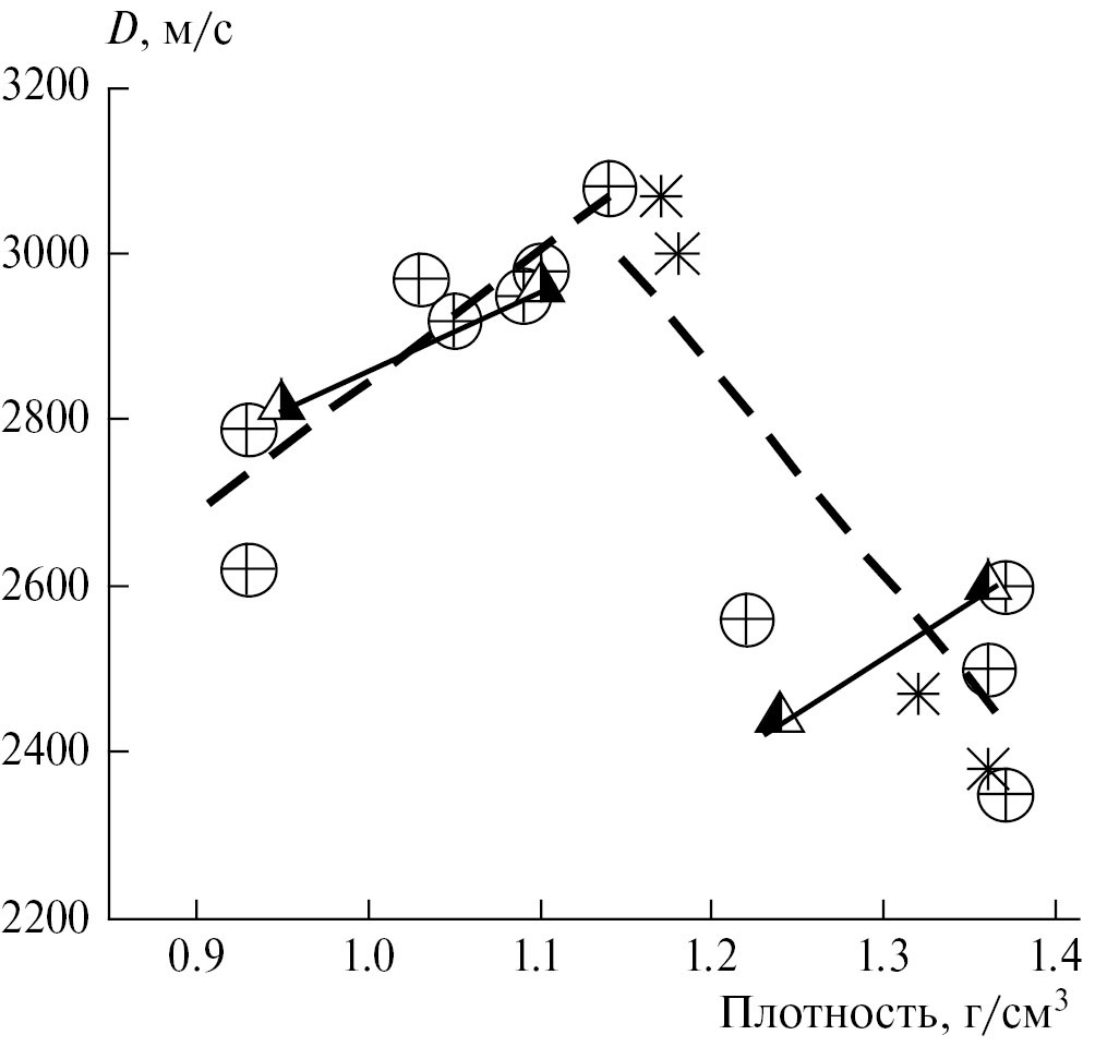 Чтобы получить согласие расчетов с экспериментом при плотности смеси 1.1 г/см3, значения коэффициентов G взяли равными 0.28, 0.06 и 0.25 мкс–1. Рассчитанная скорость детонации совпала с измеренной, составив 2960 м/с. При дальнейшем снижении плотности рассчитанная скорость детонации падает приблизительно так же, как в эксперименте.