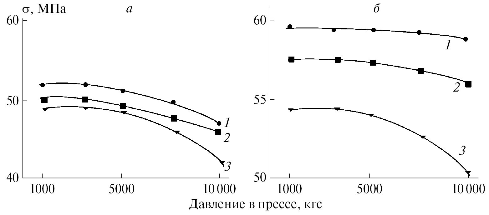 Рис. 3. Зависимость разрывного напряжения образцов ПЛА-1 (а) и ПЛА-2 (б) от величины давления в прессе для образцов, полученных со скоростью охлаждения после прессования 10 (1), 15 (2) и 60°С/мин (3).