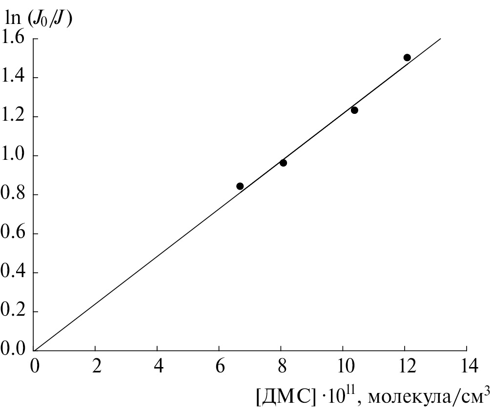 Рис. 2. График зависимости ln(J₀/J) от концентрации ДМС. Условия реакции: температура – 308 К, давление в реакторе – 0.95 Торр, [Cl] = 3.2 ‧ 10¹¹ молекул/см³ и [ДМС] = 5.1 ‧ 10¹¹ молекул/см³. Разбавителем служил гелий.