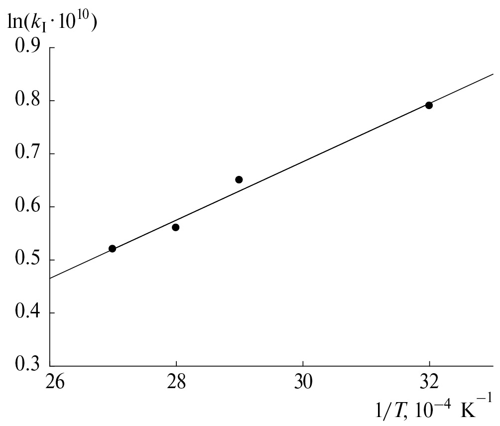 T, K | (1/T) ‧ 10³, град-1 | kI ‧ 10⁻¹⁰, молекула⁻¹‧ см³ ‧ с⁻¹ | ln (kI ‧ 10⁻¹⁰) |