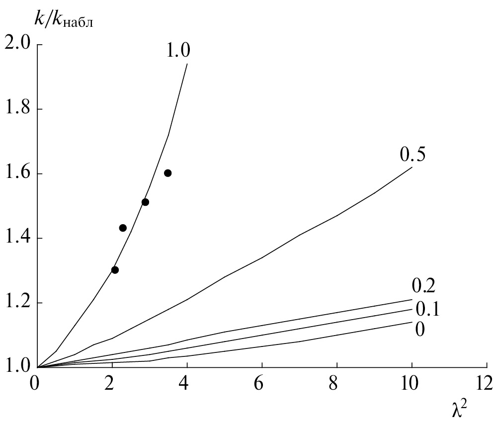 Рис. 5. График теоретической зависимости k/kнабл от λ² для случая чисто гомогенной реакции (нижняя кривая), чисто гетерогенной реакции (верхняя кривая) и для случаев, когда отношение kгет /(kгет + kгом) = 0.1, 0.2 и 0.5. Черные кружки – экспериментальные данные.