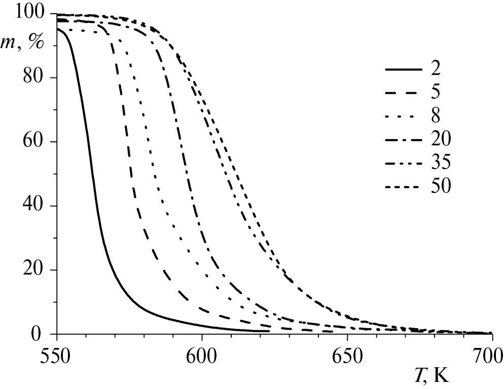 На рис. 1 приведены кривые изменения массы при термическом разложении образцов ПММА в потоке окислителя. В окислительной среде происходит полное разложение образцов ПММА в диапазоне температур 550–700 К. По мере прогрева навески происходит разложение образца ПММА на простые вещества. Одновременно с разложением полимера протекают реакции окисления как продуктов разложения, так и самого ПММА. Из рис. 1 видно, что с увеличением скорости нагрева кривая разложения сдвигается в область более высоких температур. В потоке окис лителя навески ПММА полностью разлагаются при достижении температур, равных 615, 640, 675, 680, 695 и 700 К для скоростей нагрева в 2, 5, 8, 20, 35 и 50 К/мин соответственно. Сдвиг температуры окончания этого процесса при увеличении скорости нагрева в рамках термогравиметрического анализа в основном связан с инерционностью системы.