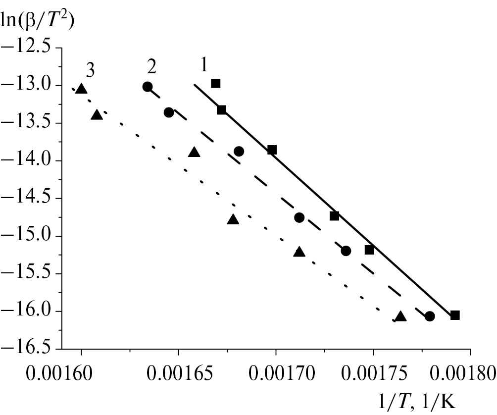 На рис. 2 представлены кривые зависимости ln(β/T 2) = f(1/T) при разных значениях степени превращения ПММА (25, 50 и 75%) для определения кинетических констант его термического разложения в окислительной среде. Символами (квадрат, кружок, треугольник) обозначены экспериментально полученные значения. Из рисунка видно, что зависимости ln(β/T 2) = f(1/T) имеют практически линейный характер и могут быть аппроксимированы по методу Киссинджера. Угловой коэффициент линейной функции позволяет рассчитать энергию активации, а свободный коэффициент – вычислить предэкспонент. Результаты расчета кинетических констант разложения образцов ПММА представлены в табл. 1. Из этой таблицы видно, что энергия активации термораспада ПММА снижается с 193.3 до 150.2 кДж/моль с ростом степени превращения от 25 до 75%. Аналогичная тенденция характерна для изменения значений предэкспонента. Эта величина также снижается с ростом степени превращения ПММА. Данные табл. 1 позволяют оценить константу скорости реакции разложения ПММА в окислительной среде.