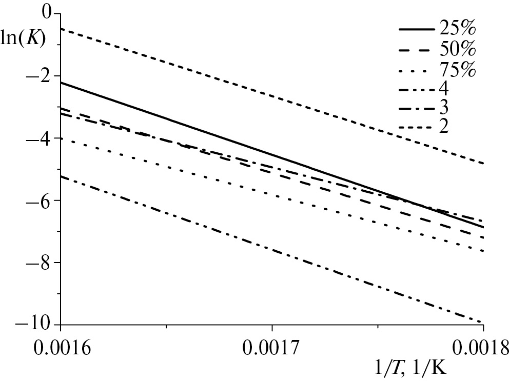 На рис. 3 представлены кривые температурной зависимости ln(K) = (ln(k0) − E/RT, где К – константа скорости реакции разложения ПММА. Так как порядок реакции разложения близок к единице, то константы скорости (кроме первой реакции из табл. 2) можно сравнивать друг с другом. На этом рисунке показаны константы скорости разложения для степеней превращения 25, 50 и 75%, а также данные последовательных реакций из работы [30] (цифрами 2–4 обозначены номера реакций в порядке представления в табл. 2). Видно, что с увеличением степени разложения ПММА константа скорости снижается при постоянном значении температуры. Таким образом, процесс разложения ПММА происходит со снижением скорости. Поэтому при моделировании процесса разложения ПММА для относительно небольших степеней разложения целесообразно использовать значение константы скорости, полученной для степени разложения 25%. А для моделирования всего процесса – использовать константу скорости, полученную для степени разложения 50%.