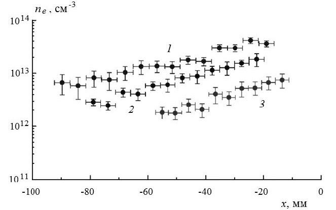 Зависимость концентрации электронов ne от расстояния х до ударного фронта при различных скоростях ударной волны показана на рис. 2. Видно, что с увеличением х и уменьшением скорости ударной волны величина ne уменьшается. Концентрация нейтральных частиц газа в рассматриваемой области при p0 = 0.23 Торр и температуре T0 = 300 K составляет порядка 7.3 × 1015 см−3. Соответственно, степень ионизации воздуха при VSW = 12.3 км/с на расстоянии x = −80 мм равна примерно 0.1%. Электронная температура Te, необходимая для оценки концентрации ne, при данных скоростях ударной волны практически постоянна и составляет величину порядка (4000 ± 1000) K.