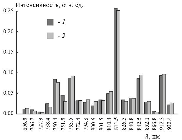 Рис. 6. Интенсивность эмиссионных спектральных линий аргона, измеренная в плазме магнетронного разряда при мощности разряда 1 кВт и давлении 0.06 Па (1) и вычисленная с помощью столкновительно-радиационной модели (2) [62].