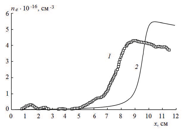 Рис. 7. Сравнение экспериментальной зависимости ne = ne(x) за падающей ударной волной в Ar (1) при p0 = 5 Торр и VSW = 4.2 км/с [75] с результатами расчета (2) по столкновительно-радиационной модели [76].
