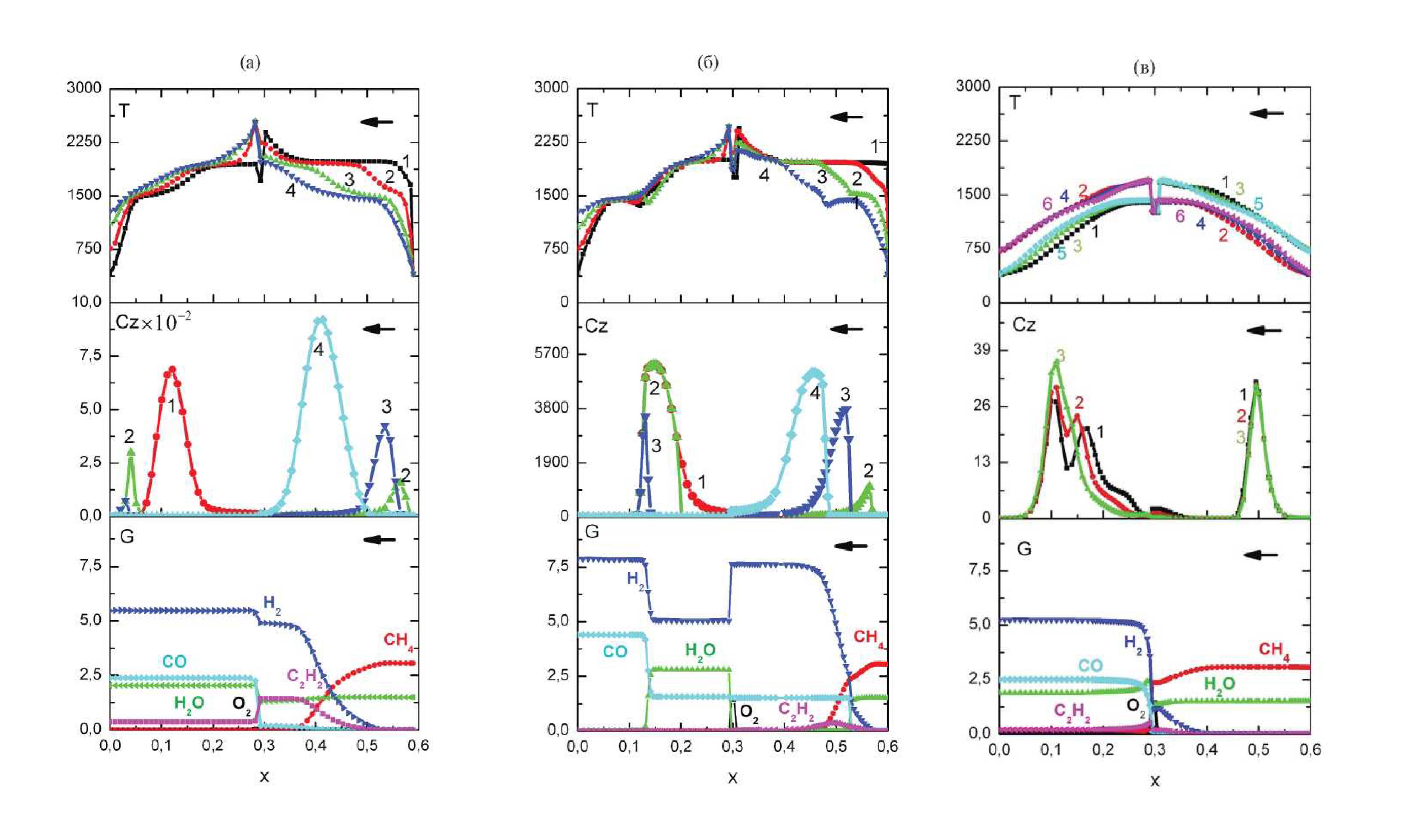 На рис. 1в также представлены кривые распределения расходов основных реагентов (O2, СH4, H2O) и целевых продуктов (H2, CO, C2Н2) в одном полуцикле в момент времени перед переключением направления потока газа и распределения концентрации сажи, Cz, в течение одного полуцикла. Особенности, связанные с большим количеством сажи, образующейся на начальном этапе процесса в результате распада метана и полного расходования пара, подаваемого в метанопаровой смеси, отмеченные для варианта 1.2, имеют место и в этом случае, приблизительно на тех же временах процесса, но пространственное положение зоны сажеобразования смещено по длине реактора. Постепенное уменьшение максимальной температуры приводит к сокращению количества образующейся сажи и снижению ее влияния на процесс, а в центре реактора устанавливается режим окисления метана с отношением концентраций H2/CO, равным ~2 в продуктах. Как видно из рис. 1в, на выходе из реактора получается столько же водорода, что и для варианта 1.1 (рис. 1а).