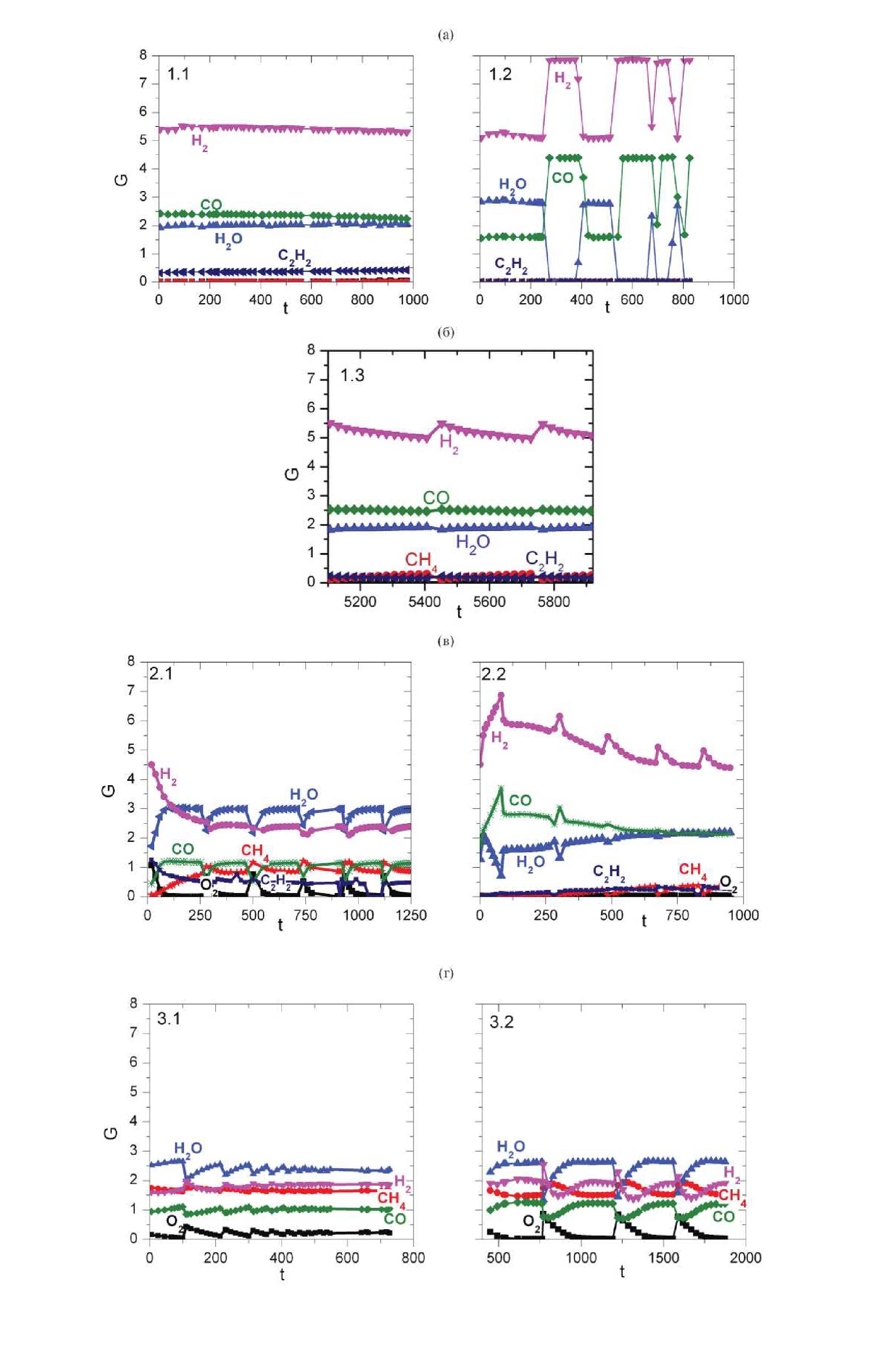 Рис. 2. Зависимости изменения со временем t (c) потоков Gi (моль/м2/c) на выходе из реактора для реагентов СН4, О2, Н2О и продуктов Н2, СО, С2Н2 для различных вариантов расчета: 1.1 и 1.2 (а), 1.3 (б), 2.1 и 2.2 (в), 3.1 и 3.2 (г) – в течение нескольких циклов.