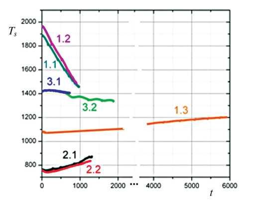 Отметим, что средняя температура Ts для вариантов 1.1, 1.2, 2.1 и 2.2 за время численного эксперимента не достигла стационарного значения, а продолжала падать для вариантов 1.1, 1.2 и расти для вариантов 2.1 и 2.2. В варианте 1.3 (инициирование узкой высокотемпературной “ступенькой”) происходит первоначально быстрое снижение средней температуры: максимальная температура падает за счет эндотермических реакций разложения метана и реакций сажи с паром, протекающих при высокой температуре, которое сменяется переходом к медленному росту по мере того, как расширяется прогретая высокотемпературная зона.