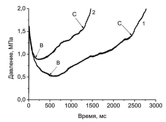Рис. 5. Изменение зависимости давления от времени при сгорании смесей 18 вес.% АСД-4 + 82 вес.% АС (кривая 1, опыт № 661) и 18 вес.% ПАП-2 + 82 вес.% АС (кривая 2, опыт № 711).