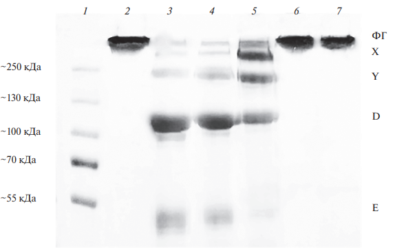 Опосредованный плазмином гидролиз фибриногена приводил к накоплению продуктов распада фибриногена – фрагментов X, Y, D и E. Окисление плазминогена 30 мкМ HOCl/–OCl (рис.1, дорожка 4) практически не влияло на накопление продуктов распада фибриногена по сравнению с таковыми для контрольного образца (дорожка 3). При окислении плазминогена 62.5 мкМ HOCl/–OCl (дорожка 5), наблюдалось снижение активности образованного из него плазмина, о чем свидетельствует снижение содержания позднего продукта распада фибриногена, фрагмента Е, и увеличение количества ранних и промежуточных продуктов, фрагментов X и Y; при этом сохраняется часть исходного фибриногена. В то же время при более высокой дозе окислителей (125 и 250 мкМ HOCl/–OCl) ферментативная активность молекул плазмина практически исчезает, о чем свидетельствовала сохранность большей части исходного фибриногена (дорожки 6 и 7).