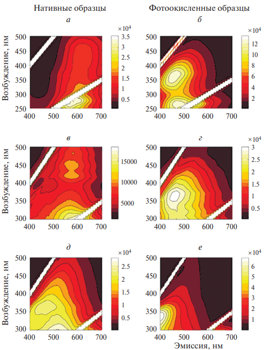 Флуоресцентный 3D-анализ. Для более подробного флуоресцентного анализа были получены 3D-спектры флуоресценции всех исследуемых образцов, а также синтетического А2Е (рис. 2). На 3D-спектрах синтетического А2Е (рис. 2а и б), суспензии ЛГ (рис.2в и г) и хлороформных экстрактов ЛГ (рис. 2д и е) видно, что при фотоокислении всех образцов наблюдается сдвиг участков эмиссии флуоресценции в синюю область спектра. Для облученного синтетического А2Е (рис. 2б) выявлены два таких участка: возбуждение при 270 нм с эмиссией при 470 нм и возбуждение при 370 нм с эмиссией при 460 нм. Профиль флуоресценции показывает, что максимумы эмиссии находятся в области с длиной волны менее 500 нм. Скорее всего, это может быть связано с накоплением продуктов окисления А2Е. Можно предположить, что при фотоокислении происходит разрушение исходной структуры сопряжения А2Е и накопление продуктов окисления с более короткой структурой сопряжения. Аналогичная тенденция к изменению профилей флуоресценции в результате облучения наблюдается как для суспензии ЛГ (рис. 2в и г), так и хлороформного экстракта ЛГ (рис. 2д и е).