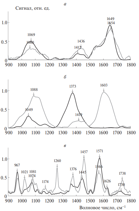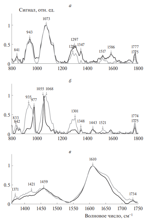 Рис. 4. ИК-спектры образцов до (черный спектр) и после воздействия видимого света (серый спектр): а – суспензия липофусциновых гранул, б – хлороформные экстракты из ЛГ, в – синтетический А2Е.