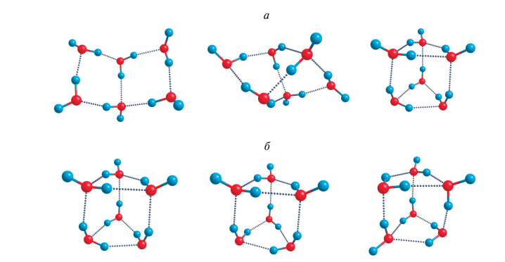 Рис. 1. Виды изомерии кластеров воды: a – три типа кислородных “скелетов” для гексамера воды, б – некоторые из возможных ориентационных изомеров для одного кислородного “скелета”.