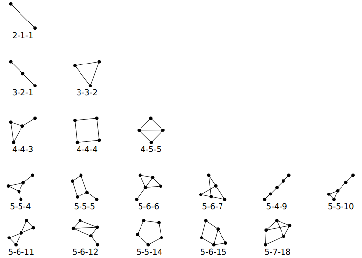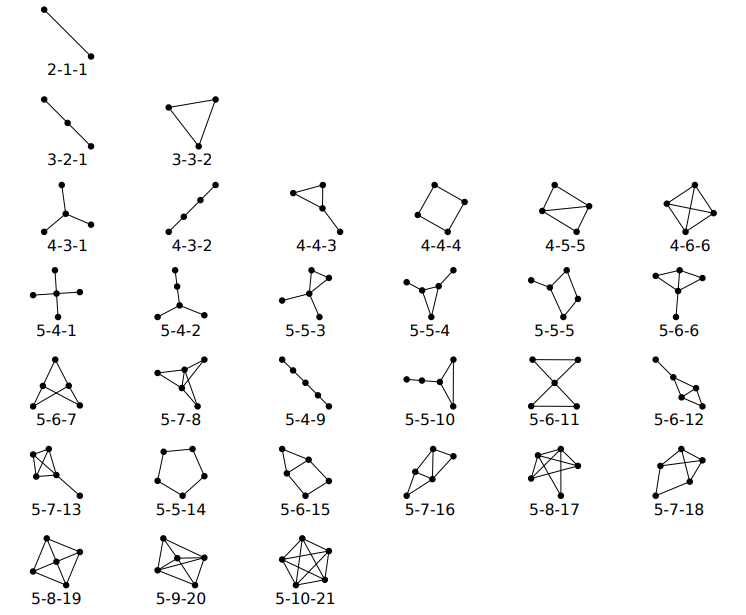 Списки связных неориентированных графов с числом вершин от 2 до 10 в формате g6, полученные Брэнданом Маккеем, представлены на сайте [37]. Для дальнейшей работы с помощью оригинальной программы, написанной на языке Python, были отобраны графы с числом вершин от 2 до 5 (соответствующие кластерам от димера до пентамера включительно) и степенью каждой вершины не более 4 (что обеспечивает выполнение модифицированных для газофазных кластеров воды правил Бернала–Фаулера). Для n = 2, 3, 4, 5 заданным условиям удовлетворяют 1, 2, 6, 21 граф, соответственно; отобранные графы приведены на рис. 3. Связные неориентированные графы (и соответствующие им кислородные “скелеты”), рассматриваемые в работе, обозначаются как (v-e-m), где v – число вершин графа (число молекул воды в кластере), e – число ребер графа (число водородных связей в кластере), m – порядковый номер, который присваивается каждому кластеру (H2O)n в пределах одного n.