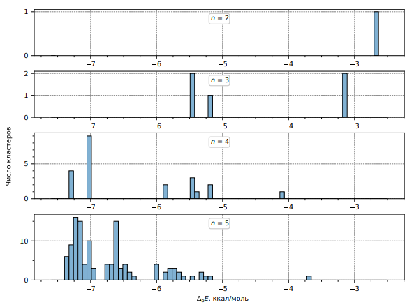 Концентрация Cav может быть как больше, так и меньше Cmin. Для расчета Cav используется усредненное значение DrG°298 K, а для расчета Cmin – значение DrG°298 K, соответствующее кластеру с наименьшей энергией связывания ΔbE. При этом у кластера с наименьшей энергией связывания ΔbE энергия DrG°298 K не всегда оказывается также наименьшей (для данной группы кластеров). Следовательно, усредненное значение DrG°298 K может оказаться меньше, чем DrG °298 K самой низкоэнергетической структуры. Это объясняет случаи, когда Cav оказывается больше Cmin.