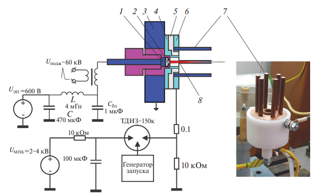 Рис. 1. Электрическая схема и общий вид комбинированного разрядника МПК-ЭП: 1 – внутренний электрод (анод) ЭП; 2 – капиллярный разрядный канал ЭП; 3 – корпус разрядника; 4 – катод ЭП / анод МПК; 5 – изолятор; 6 – катодный фланец МПК, 7 – катодные стержни МПК; 8 – гетерогенная плазменная струя (ДЭП).