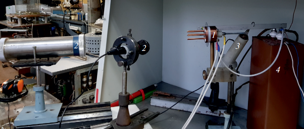 Рис. 2. Общий вид лабораторного стенда: 1 – комбинированный разрядник МПК-ЭП; 2 – датчики давления; 3 – высоковольтный пробник P6015; 4 – емкостной накопитель.
