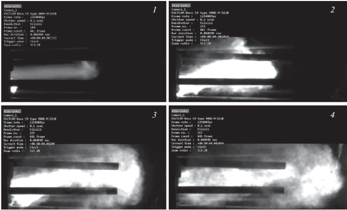 Для изучения структуры, а также пространственной и временно́й эволюции комбинированного разряда МПК-ЭП использовали высокоскоростную видеокамеру Photron Fastcam Nova S9 (Photron, USA), (рис. 3). В ходе экспериментов было обнаружено, что в определенном диапазоне времен задержки включения МПК возникает направленное движение ДЭП вдоль оси разрядника, которое можно охарактеризовать как движение “плазменного поршня”, форма которого близка к цилиндрической (см. рис. 3). Измерения, проведенные с помощью датчиков давления, выявили сильную анизотропию распределения давления на фронте УВ вблизи границы “плазменного поршня”, что принципиально отличается от картины распределения давления, измеренной в работе [2] для случая сферической стимулированной детонации ДЭП. Этот результат был также подтвержден с помощью оптического теневого метода. При оптимальном времени задержки включения МПК td ~ 2000 мкс средняя скорость переднего фронта плазменной струи (“плазменного поршня”) достигает Vp2 ~ 1000– 1200 м/с (здесь и далее индекс “p” означает, что переменная относится к плазменному поршню). Эта величина значительно превышает скорость переднего фронта плазменной струи Vp1 ~ 450–600 м/с, зарегистрированной в работе [2] при малых временах задержки td ~ 50 мкс.