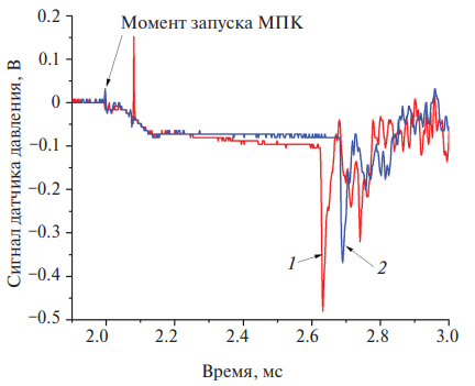 Рис. 4. Временная эволюция давления P2(t) за фронтом УВ, зарегистрированная датчиком давления: 1 – рабочая смесь ПММА + TiHx, 2 – рабочая смесь ПММА. Время задержки между включением ЭП и МПК – td ~ 2000 мкс.