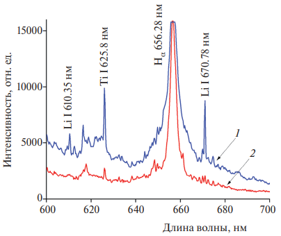 Обнаружено, что дополнительное инжектирование частиц TiHx в разрядную область МПК-ЭП приводит к появлению в оптических спектрах интенсивных линий Li I: 610.35 нм и 670.78 нм (кривая 1 на рис. 5). Обращает на себя внимание отсутствие названных линий в исходном спектре излучения ДЭП, зарегистрированном без инжекции такой примеси (кривая 2 на рис. 5). Этот результат не совсем понятен и требует детального изучения в будущих экспериментах.