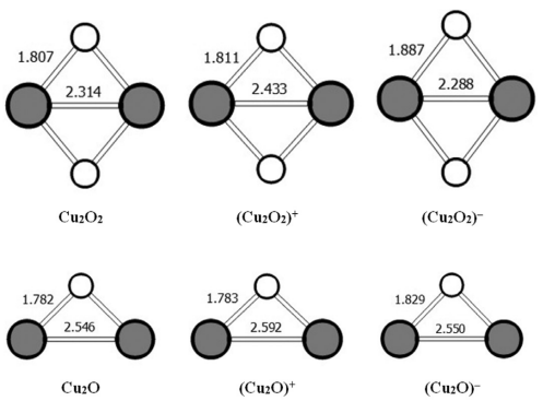 Рис. 2. Структуры электронейтральных, а также положительно и отрицательно заряженных окиси меди Cu2O2 и закиси меди Cu2O: серые кружки – Cu, белые – O. Числа – расстояния в ангстремах.