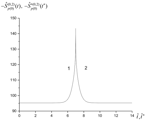 Рис. 3. Поведение во времени производной парной энтропии, при Re = 400. Функция ∂^Sp(0(0,2))(t)/∂t, рассчитанная по решению Sol0 в пределах полусферического концентрического слоя H0 за вычетом пространственного полусегмента, представлена кривой 1; ^r2 = 2.12, ^r3 = 1.0. Сумма двух функций, ^Sp(0(1,2))(t) и ^Sp(1(2,2))(t), представлена кривой 2. Составляющая ^Sp(0(1,2))(t) рассчитана по решению Sol0 в пределах полусферического концентрического слоя H1, ^r1 = 1.571; составляющая ^Sp(1(2,2))(t) рассчитана по решению Sol1 в пределах области существования решения, расположенной на внешней границе полусферического концентрического слоя H1. Время перестроения ^t1 = 6.9857, t = (Re a/(2U0))^t.