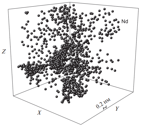 Рис. 5. Размещение ионов Nd3+ в системе FLiNaK + + 15 мольн.% NdF3 в конце расчета при температуре 1020 К.