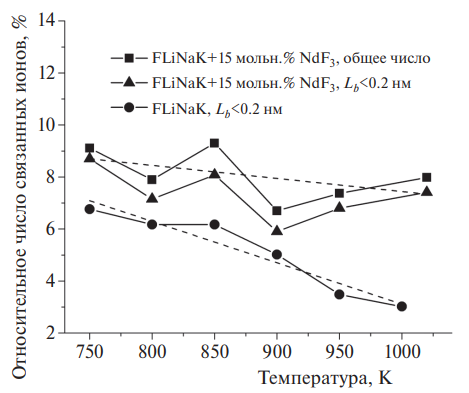 Рис. 7. Температурная зависимость относительного числа связанных ионов для систем FLiNaK и FLiNaK + 15 мольн.% NdF3; штриховые линии – линейная аппроксимация представленных зависимостей; на рисунке термин “общее число” означает, что учитываются длины связей Lb всех положительных ионов с F -, не превышающие 0.2 нм, а также Lb растворенных ионов со связями Nd3+–F - не более 0.27 нм.