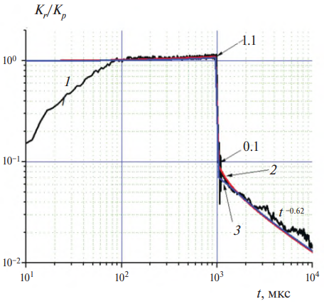 Рис. 3. Экспериментальная (1, черная, по оси ординат отложено отношение Kr /Kp) и расчетная (2, по оси ординат отложено отношение Kr /Kp′) кривые РИЭ ПЭВД при 298 К и мощности дозы 6.2 ∙ 105 Гр/с. Кривая 2 практически совпадает с кривой 1, которая при t ≤ 0.4 мкс резко спадает до нуля (показано шриховой линией) из-за влияния методических факторов (постоянная времени измерения, инерционность электронной системы и т.д.). Длительность импульса электронов – 20 мкс. Расчетная кривая (3, синяя) вычислена для параметра = 1.9 · 10–16 м2/В (табл. 2).