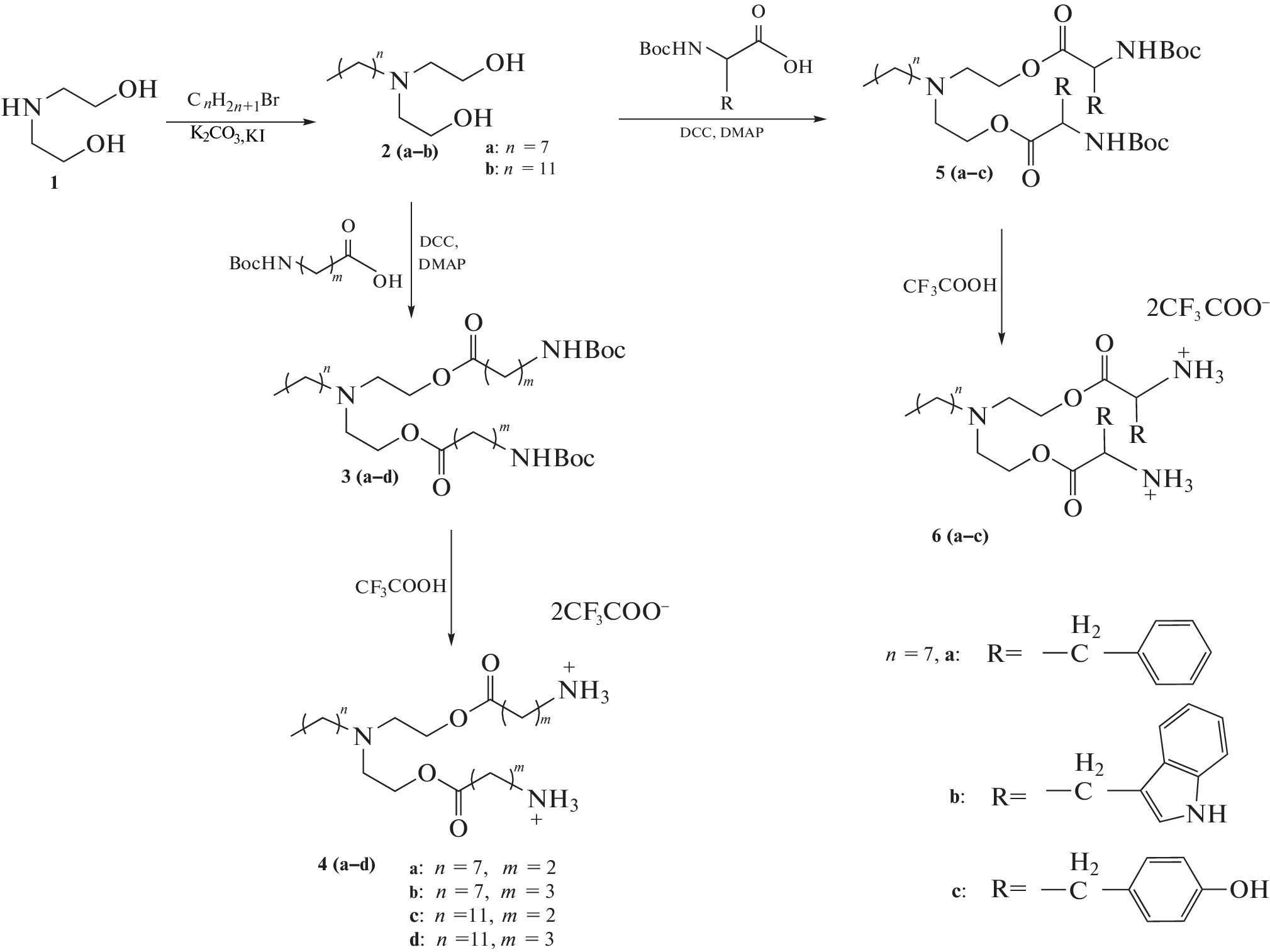 This work is aimed to develop a number of cationic amphiphiles based on amino acid derivatives of diethanolamine as potentially membrane-active antibacterial agents. The developed compounds contain two amino acid residues in the polar block and various length of aliphatic chains in the hydrophobic domain. Amphiphiles were obtained in preparative amounts sufficient to confirm their structures and perform a study of antibacterial activity. The synthesized samples based on β-Ala (4c) and GABA (4d) with an aliphatic C12 chain in the hydrophobic domain showed a promising level of antimicrobial activity (minimal inhibitory concentration, MIC, 1 μg/mL) against gram-positive (B. subtilis) and gram-negative (E. coli) bacteria. Amphiphiles containing aromatic amino acids L-Phe (6a) and L-Trp (6b) in the polar head group and C8 hydrocarbon chain are active against B. subtilis with a MIC of 1 μg/mL. The obtained data on antimicrobial activity make the selected compounds attractive for further detailed study of their mechanism of action.