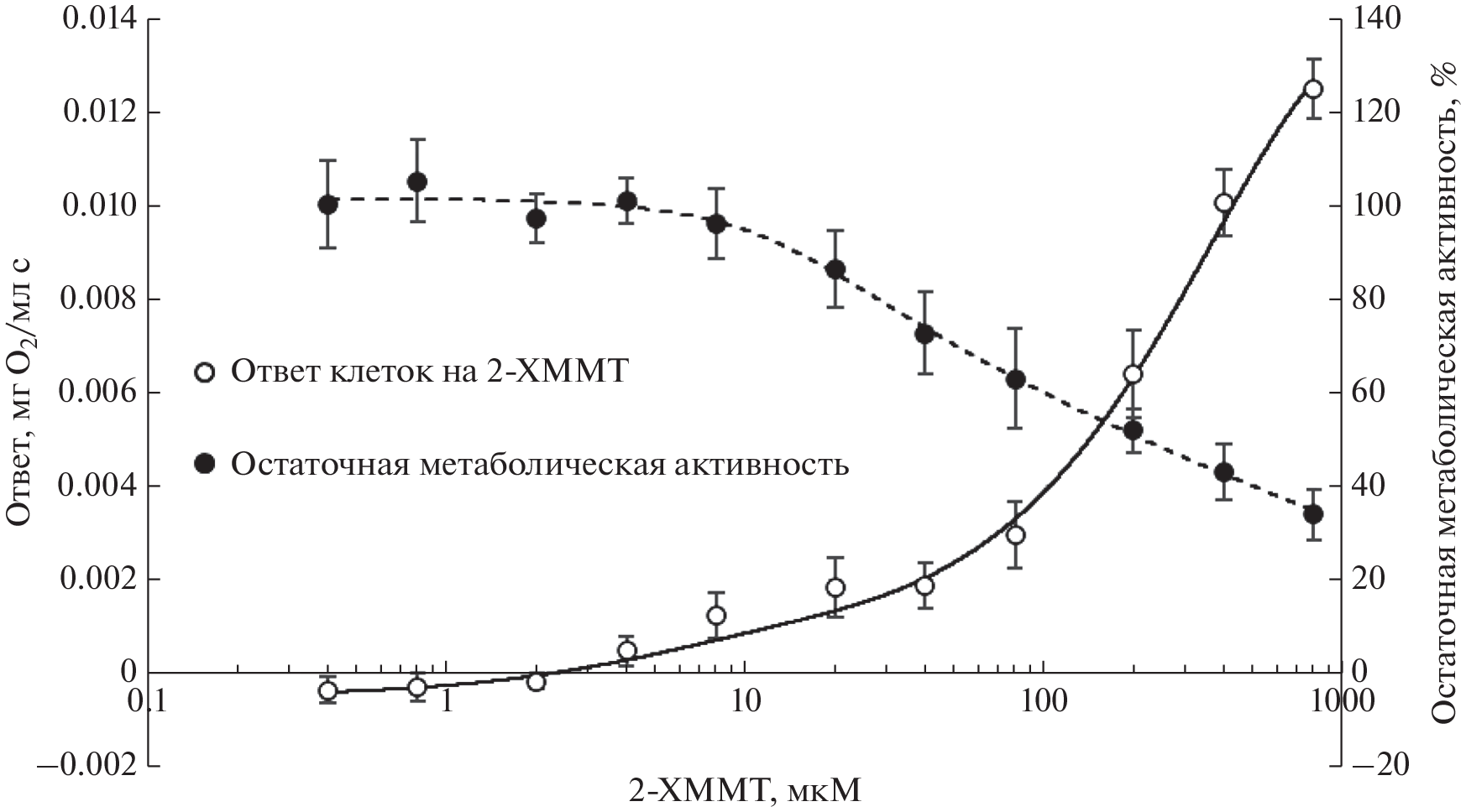 A method for evaluation of metabolic characteristics of intact cells based on electrochemical registration of their respiratory activity was used to monitor a reaction of lymphocytes to a potential pharmacological agent, 2-(chlorodinitromethyl)-4-methoxy-6-(4-methylpiperazin-1-yl)-1,3,5-triazine. The method ensured an estimation of cytotoxicity of the test compound and made it possible to determine its minimum toxic concentrations for human lymphocytes. It was shown that the obtained results agree with the data of a reference method – MTT-based cell viability assay.