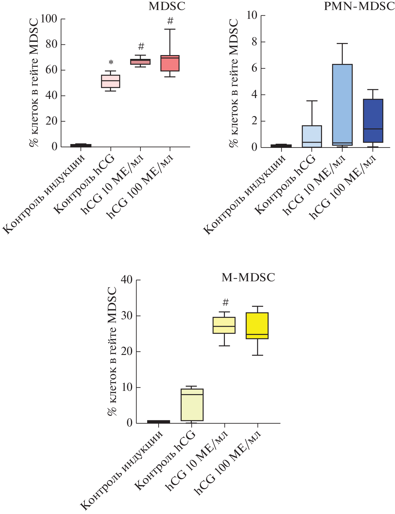 The effect of recombinant human chorionic gonadotropin (hCG) at concentrations of 10 and 100 MU/mL, typical for pregnancy, on differentiation and functional activity of myeloid-derived suppressor cells (MDSCs) was investigated. The subject of the study was isolated cells CD11b+ that acquired the MDSC phenotype as a result of two-step activation with cytokines GM-CSF and IL-1β and lipopolysaccharide (LPS). It was shown that hCG at both concentrations significantly increased the total MDSC pool and at a lower concentration (10 IU/mL) promoted differentiation of the M-MDSC subpopulation. At the same time, 100 MU/mL hCG had no effect on the expression of arginase-1 and indolamine-2,3-dioxygenase (IDO) in MDSCs, but at a concentration of 10 IU/mL there was a tendency to increase IDO expression under the influence of hCG. When the cytokine profile was evaluated by multiplex analysis using Luminex xMAP technology, it was found that hCG did not modulate cytokine production in the CD11b+ cell culture. Thus, this work demonstrates for the first time that hCG can induce MDSC differentiation.