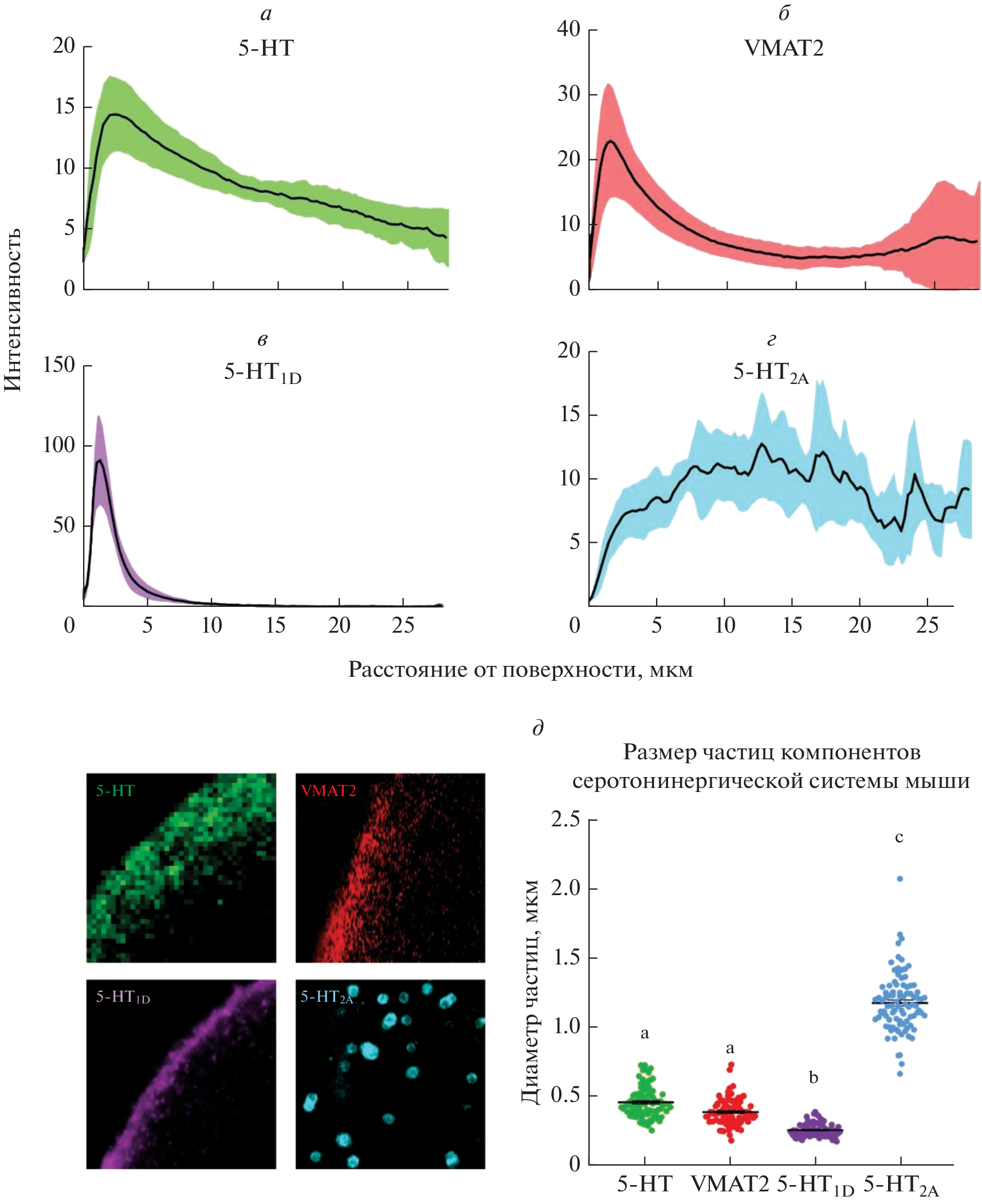 Serotonin is a regulator of early embryonic development and has a fully functional system in preimplantation mammalian embryos. In this work, we described the spatial distribution of serotonin, the vesicular monoamine transporter VMAT2, and the serotonin receptors 5-HT1D and 5-HT2A at different stages of early mouse embryonic development. Serotonin, the VMAT2 transporter, and the 5-HT1D receptor are visualized in the cortical compartment of cells, whereas the 5-HT2A receptor has a more uniform distribution throughout the cytoplasm. Comparison of the sizes of the immunoreactive particles showed that there are no statistically significant differences between serotonin and the VMAT2 transporter, which may indicate the presence of specific vesicles containing serotonin. In addition, the two serotonin receptors, 5-HT1D and 5-HT2A, showed a markedly different pattern of immunoreactivity, which may indicate that they simultaneously serve different functions in early embryogenesis.