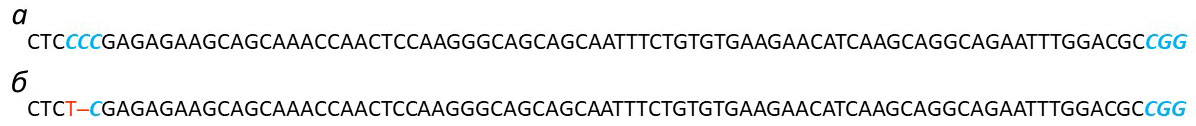Рис. 2. а — Последовательность дикого типа локуса редактирования гена IRBIT. б — Направленная мутация донорной матрицы (одиночная нуклеотидная замена C/T и ∆C), приводящая к исчезновению антисмыслового PAM и возникновению в ssDNA-доноре размером 645 п. н. сайта XhoI CTCGAG.