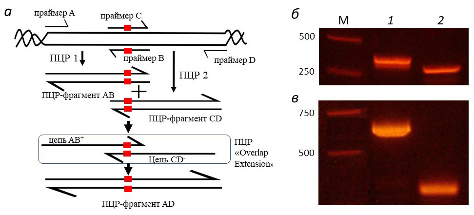 Рис. 3. а — Схема синтеза двухцепочечной матрицы с мутациями. б — Электрофорез амплифицированных мегапраймеров AB (дорожка 1) и CD (дорожка 2). в –Электрофорез синтезированных двухцепочечной dsDNA (640 п. н.) с точечной мутацией (AD) и одноцепочечной матрицы донорной ssDNA того же нуклеотидного состава (отличается от двухцепочечной по скорости миграции и интенсивности окраски бромистым этидием).
