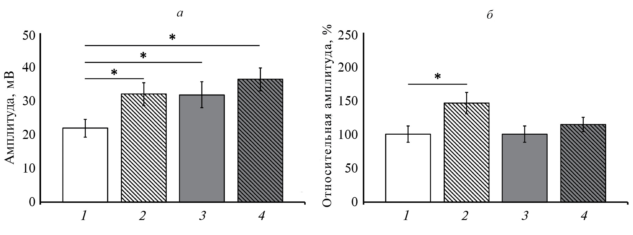 Рис. 3. Влияние блокатора калиевых каналов (ТЭА, 1 мM) на амплитуду ВП у контрольных и облученных растений пшеницы. a – Амплитуда ВП. б – Относительная амплитуда ВП; за 100% приняты значения амплитуды ВП в отсутствие ТЭА для контрольных и облученных растений. 1 – Контроль, 2 – контроль + ТЭА, 3 – ИИ, 4 – ИИ + ТЭА; n = 16; * p <0.05.
