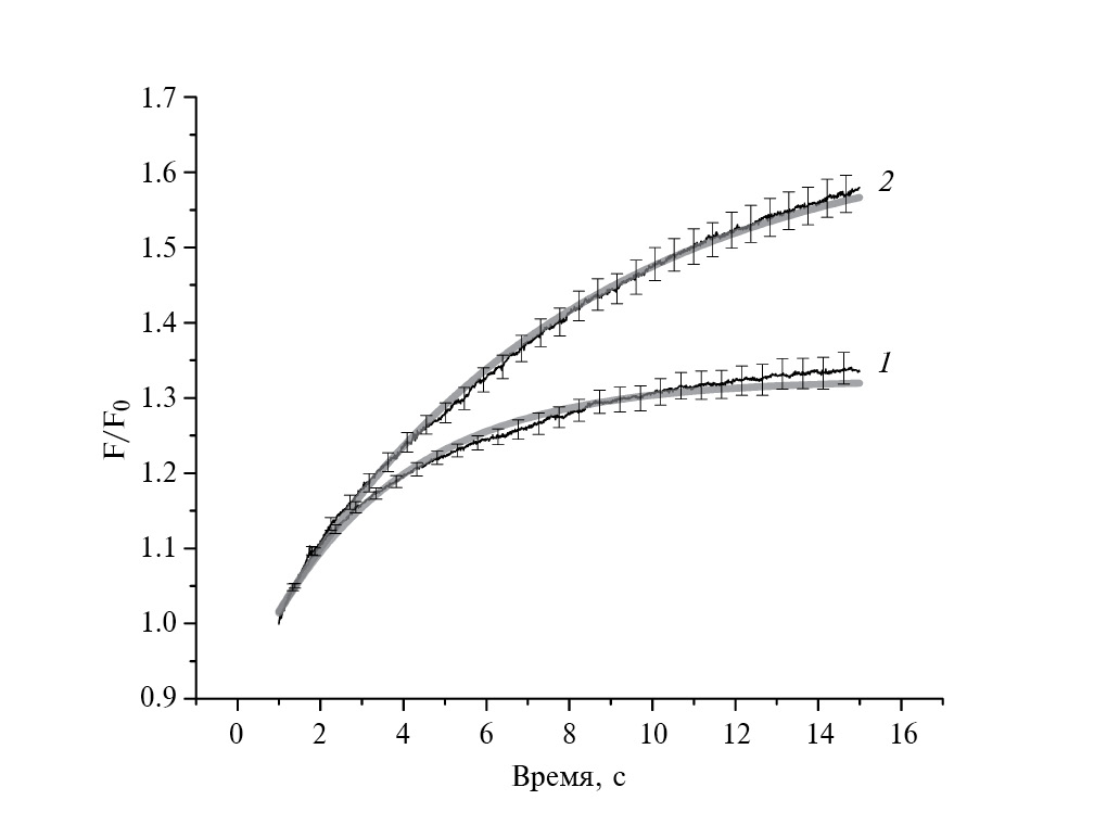 Флуоресцентный профиль (F) аппроксимировали функцией y = y0 + Ae(–t/τ). С учетом того, что, как нами показано ранее, V/V₀= F/F₀[22], где V₀ – начальный объем клетки, а F₀ – начальный уровень флуоресцентного сигнала.