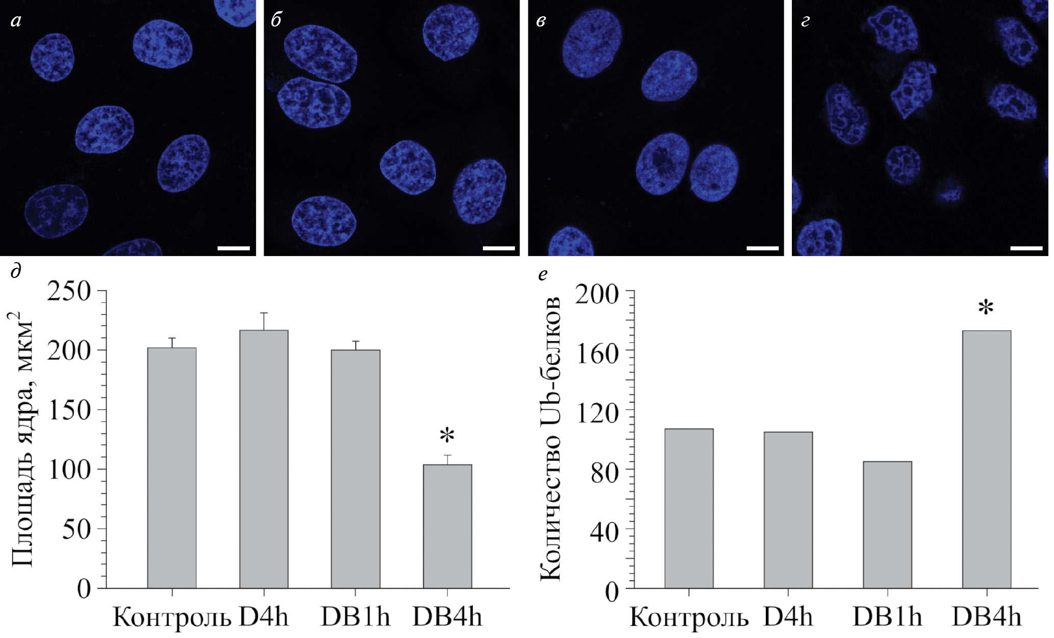 Рис. 1. Изменения формы (а – контроль, б – D4h, в – DB1h, г – DB4h), площади клеточного ядра (д – усредненные данные по трем экспериментам) и количества Ub-белков клеточного ядра (е – данные, суммированные по трем экспериментам). Линейка – 10 мкм.