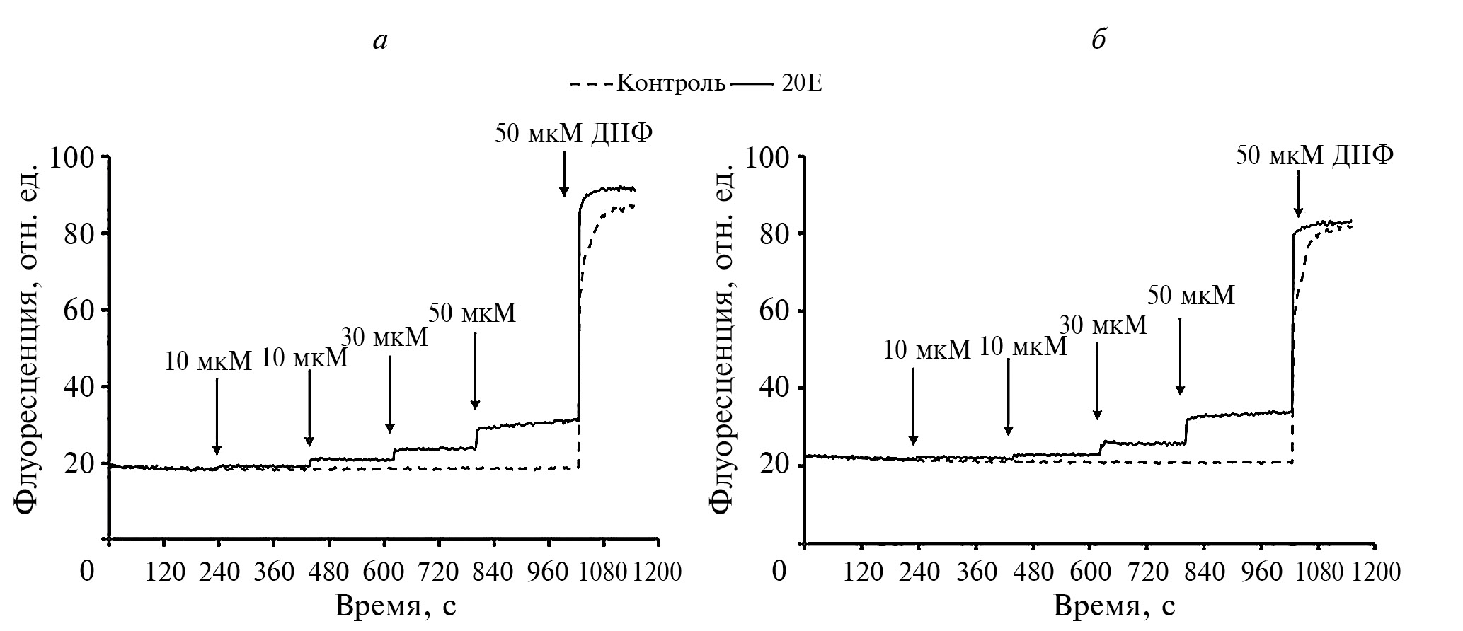 Рис. 2. Влияние 20Е на мембранный потенциал митохондрий скелетных мышц мышей, энергизованных глутамат/малатом (а) или сукцинатом (б). Субстраты и реагенты: 2.5 мM малат калия, 2.5 мM глутамат калия (а), 5 мM янтарная кислота, 1 мкМ ротенон (б). На каждом из рисунков представлены данные типичного эксперимента, полученные на одном препарате митохондрий. В каждом случае аналогичные результаты были получены еще в двух независимых экспериментах.
