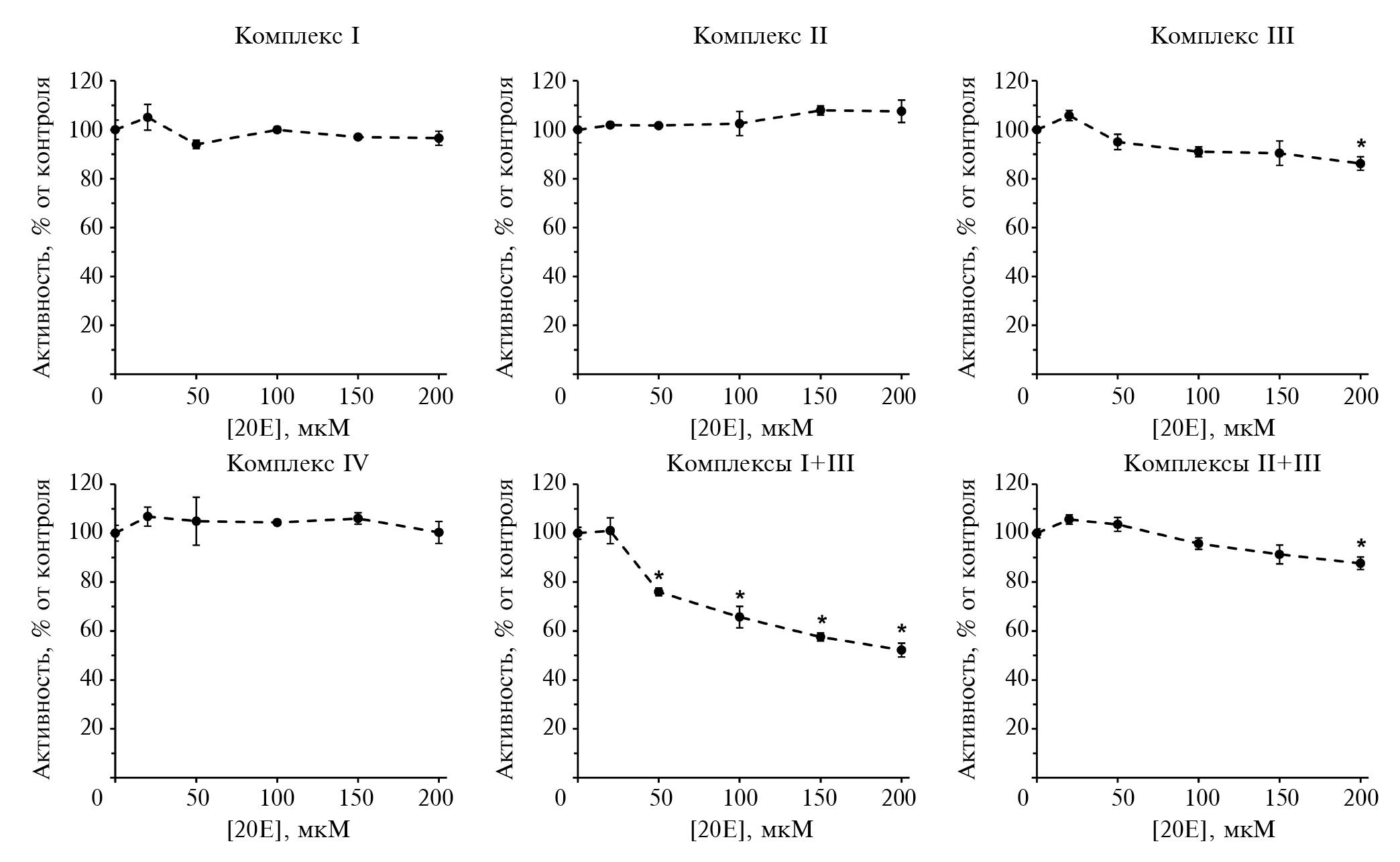 Рис. 3. Активность комплексов дыхательной цепи митохондрий в отсутствие и в присутствии различных концентраций 20-гидроксиэкдизона (значения в% активности по сравнению с контролем). Активность комплексов в отсутствие 20Е принята за 100%. Приведены средние значения ± стандартная ошибка среднего (n = 4). * p < 0.05 против контроля (отсутствие 20Е).
