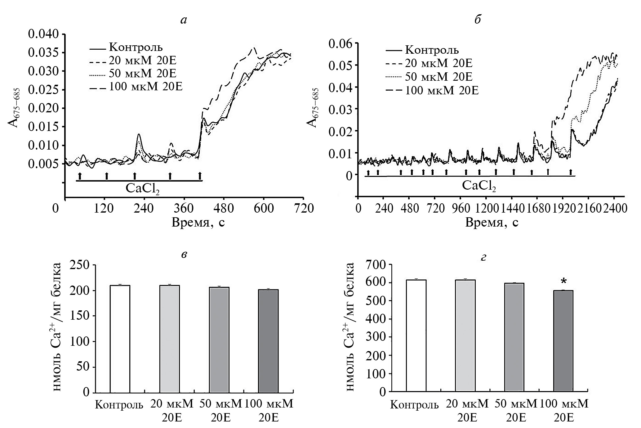 В этом случае только после пятой добавки CaCl₂ наблюдается выход Ca²⁺ из митохондрий (рис. 5а), свидетельствующий об индукции кальций-зависимой MPT-поры во внутренней мембране органелл. Предварительная инкубация митохондрий в присутствии 20Е в концентрациях 20, 50 и 100 мкМ не оказывает существенного влияния на способность митохондрий поглощать ионы кальция (рис. 5а). В митохондриях, энергизованных сукцинатом, предварительная инкубация органелл со 100 мкМ 20Е приводит к снижению способности митохондрий поглощать ионы кальция, тогда как 20 и 50 мкМ 20Е не имеют подобного эффекта (рис. 5б). Способность Ca²⁺ индуцировать открытие поры в митохондриях можно выразить, используя параметр кальциевой емкости митохондрий, т. е. то максимальное количество Ca²⁺, которое может быть аккумулировано в матриксе без последующего открытия поры [40]. Как показано на рис. 5в, 20Е не оказывает влияния на этот параметр митохондрий при энергизации органелл глутаматом и малатом во всех изученных концентрациях. В то же время при сукцинат-зависимом дыхании 100 мкМ 20Е вызывают достоверное снижение кальциевой емкости митохондрий скелетных мышц мышей по сравнению с контролем (рис. 5г). Полученные результаты свидетельствуют о том, что подавление функциональной активности митохондрий под действием 20Е также способствует снижению способности митохондрий эффективно аккумулировать ионы кальция в матриксе.
