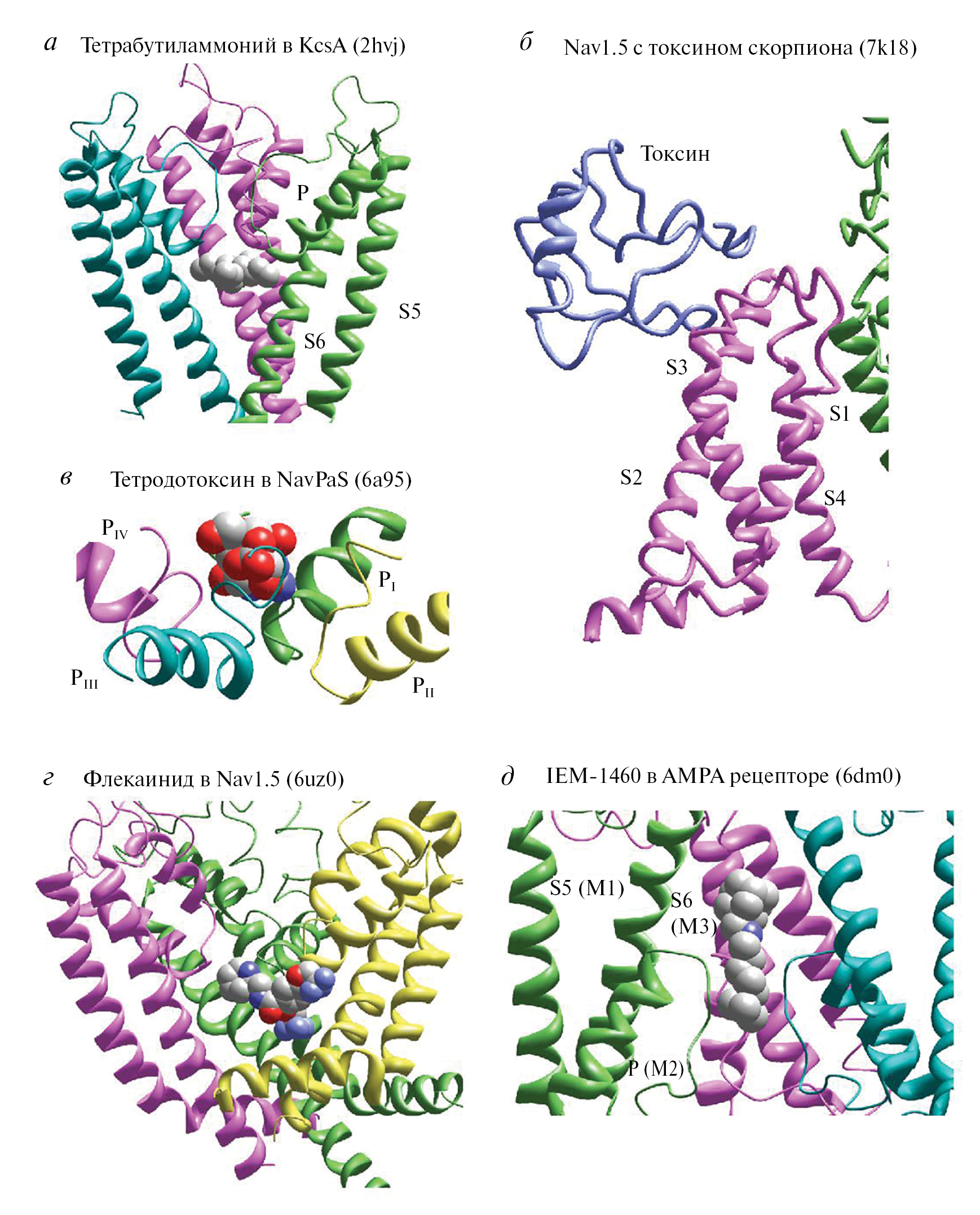 Рис. 3. Связывание лигандов в P-loop-каналах. а – Тетрабутиламмоний связывается в центральной полости KcsA. б – Пептидный токсин яда скорпиона связывается с потенциал-чувствительным доменом натриевого канала. в – Тетродотоксин связывается во внешнем вестибюле натриевого канала. г – Флекаинид связывается в центральной полости натриевого канала. д – IEM-1460 связывается во внешнем вестибюле канала AMPA-рецептора и частично проникает в селективный фильтр.